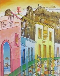 Semanas después, Javier me sorprendía con un logrado homenaje a esta Villa de Gran Canaria y me ofrecía su ilustración. Y bien, días después y con la colaboración de mi musa, Cali, nos dirigimos a sacar fotos y recorrer nuevamente los parajes y valorar sus paisajes y espacios por donde en su día paseamos… Luego se sucedieron la atenta lectura, el estudio y bocetos tras la recreación de los versos y la más que atenta supervisión del amigo, artista y maestro Antonio Sánchez.